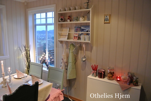 Julesokkene til meg og Katarina Othelie er hengt opp og røde sløyfer, puter og adventstaker gir hint om jul.